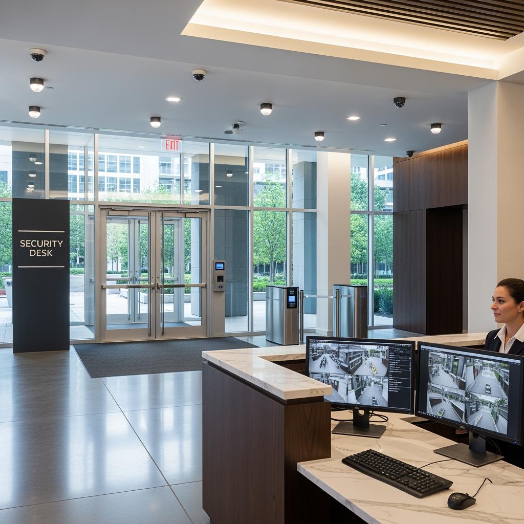 High‑resolution IP cameras form the backbone of most modern systems. They cover key zones like entrances, reception, elevator banks, stairwells, parking areas, bike rooms, and loading bays. The contractor should help you decide where fixed cameras make sense and where PTZ (pan‑tilt‑zoom) cameras are better for covering wider or more complex spaces.