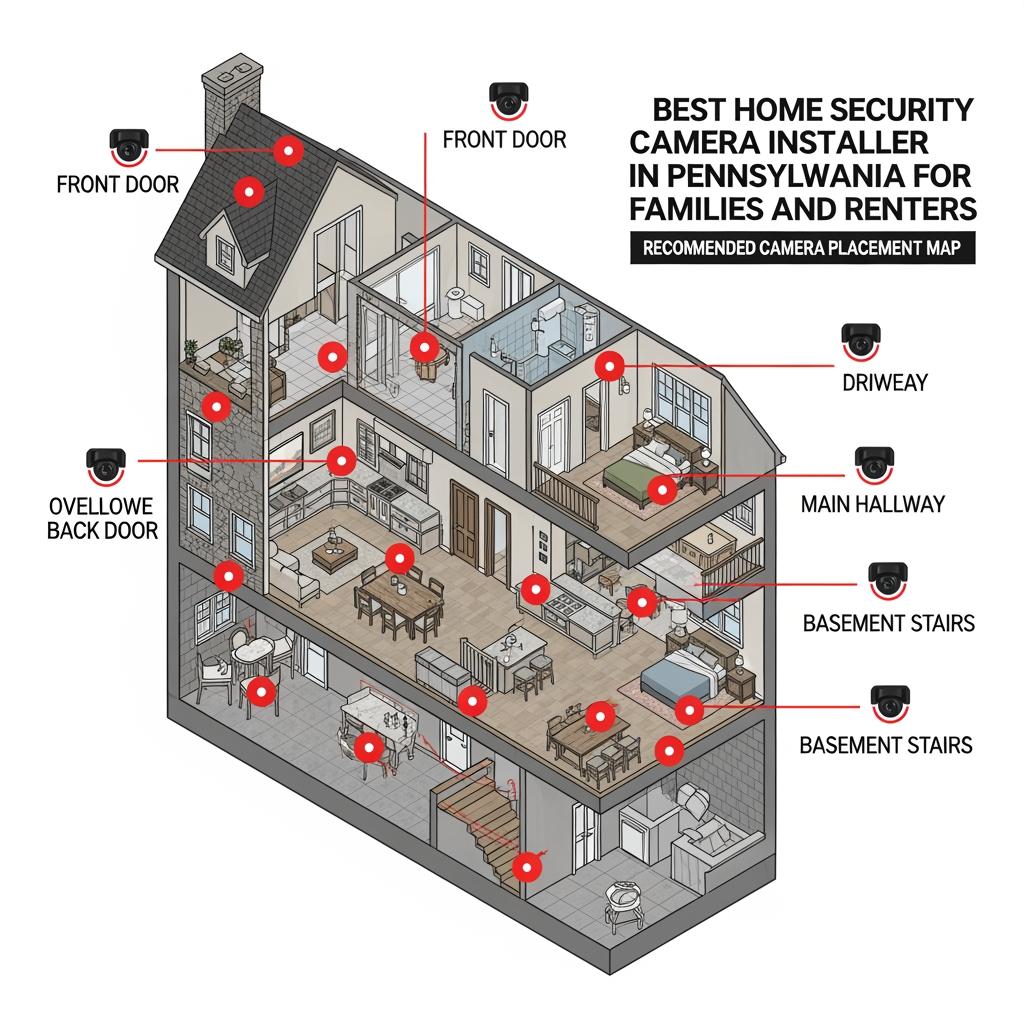 Thoughtful placement matters more than expensive equipment. In a typical Pennsylvania single-family home, the highest priorities are front and back doors, driveway or parking area, and at least one interior camera covering a central hallway or the main living area.