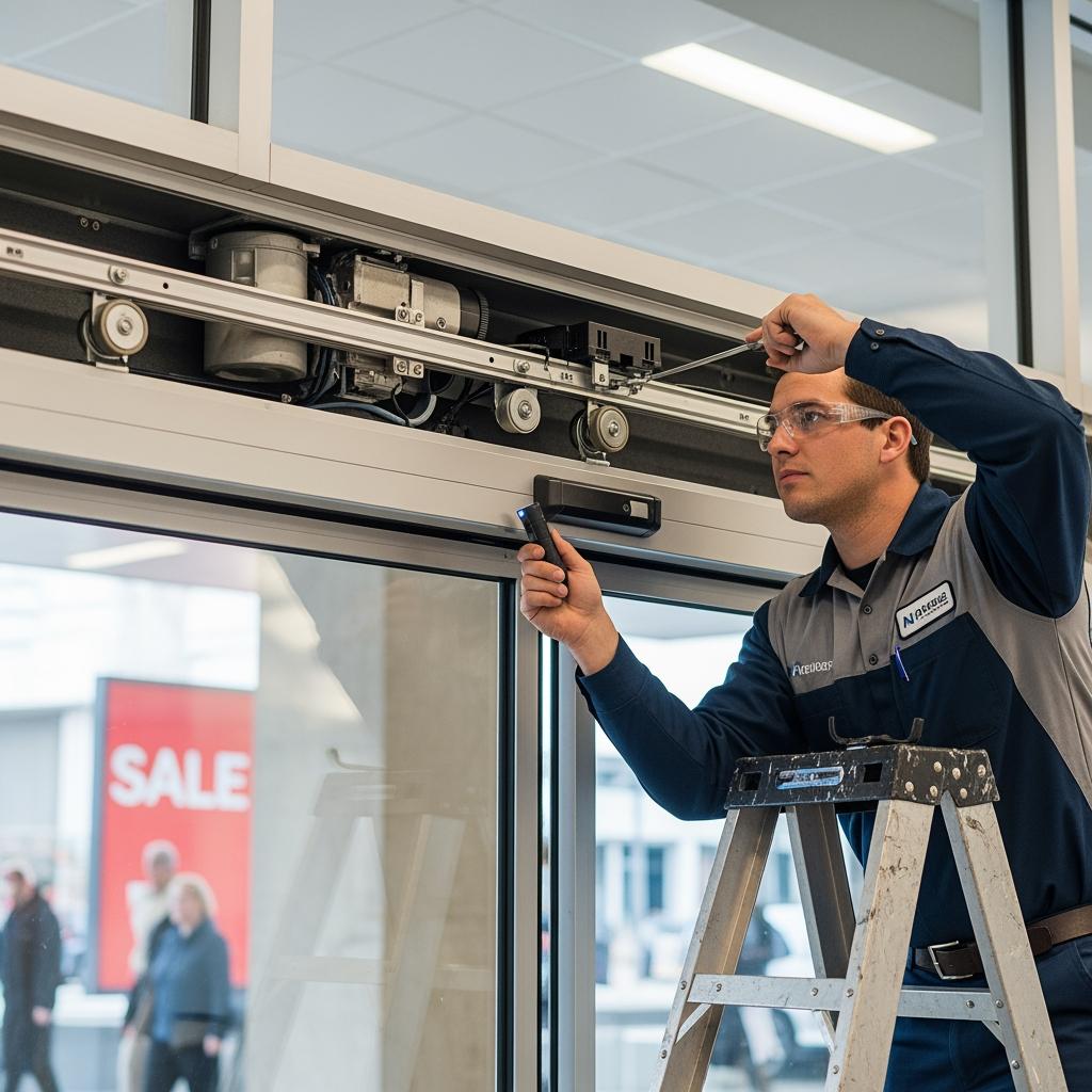 A typical project flow for a busy NC retailer looks like this: assess existing conditions and traffic โ define door type, size, and controls โ coordinate power, low-voltage, and fire alarm integration โ schedule installation during low-traffic windows โ perform safety testing and staff training. When replacing aging manual doors with new automatic ones, you may need minor structural modifications, new headers, or upgraded glass to meet current codes.