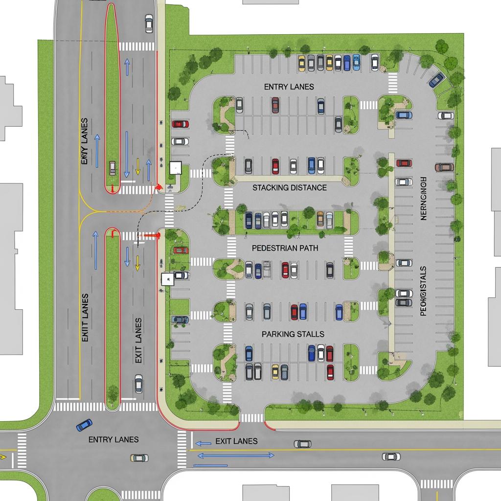 Start by mapping out how vehicles approach and leave the site. In busy areas like Raleigh, Charlotte, and Durham, you may need longer stacking lanes to keep queuing vehicles from backing up into public roads. A general rule of thumb is to plan for at least three to five vehicles of stacking room ahead of each entry gate and at least two to three vehicle lengths for exit lanes, adjusting up for rush‑hour peaks.