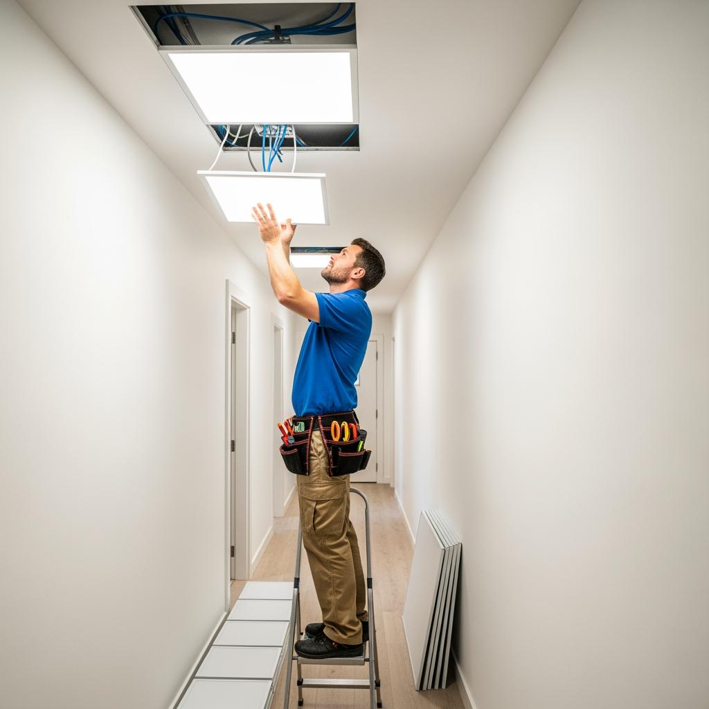 For apartment and condo owners, the two most common scenarios are replacing drop‑ceiling fluorescent troffers with 2×2 or 2×4 LED flat panels, and converting surface‑mount fixtures in kitchens, hallways, and laundry rooms to low‑profile LED panels. In both cases, the electrician assesses the existing wiring, confirms circuit capacity, and ensures that any shared‑circuit issues in multi‑unit buildings are addressed to avoid nuisance breaker trips.