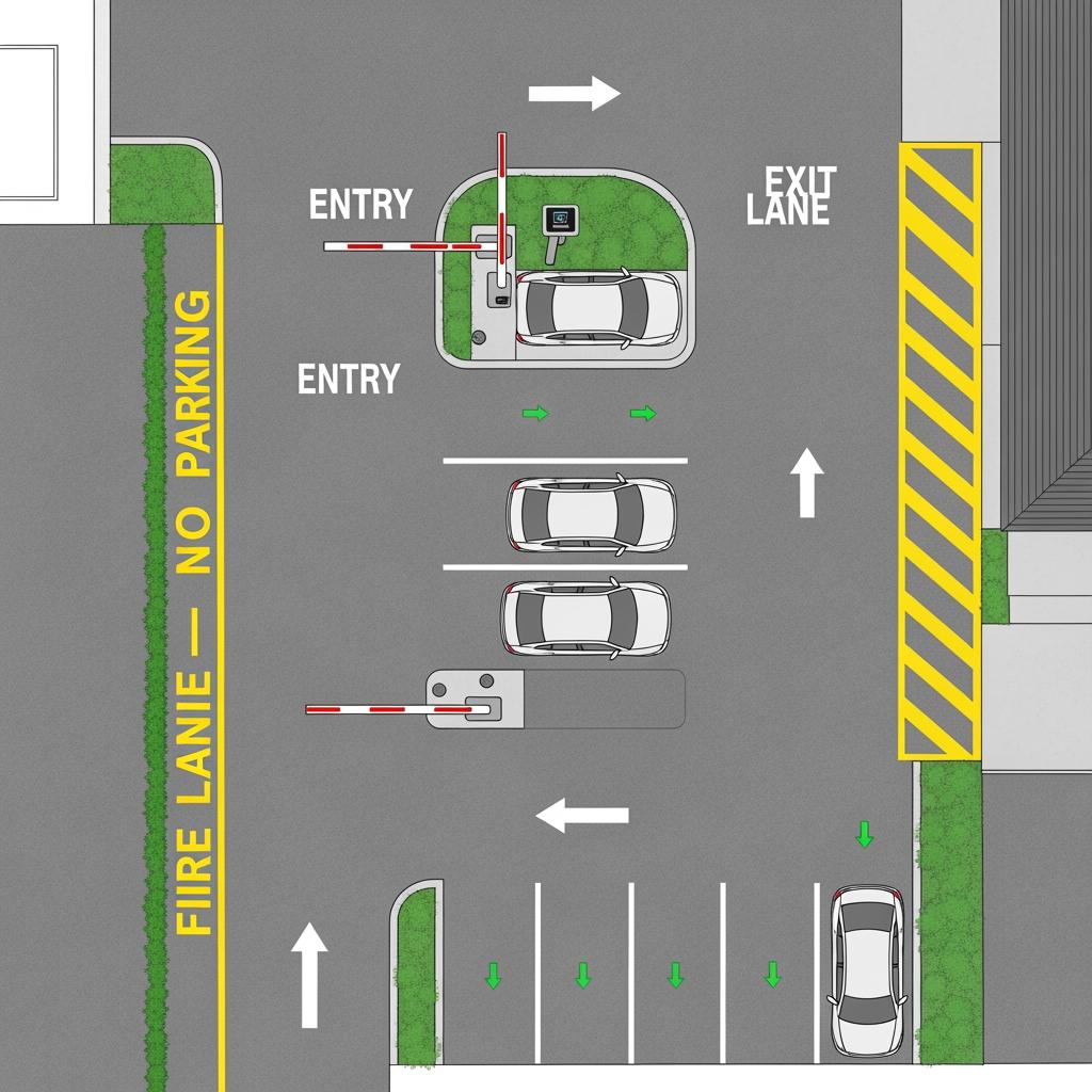 In compact lots, a single combined entry/exit lane may be all that fits. In those cases, it’s crucial to provide a buffer area inside the barrier for vehicles to clear the public right-of-way before stopping again. Where possible, separating entry and exit lanes with islands or bollards reduces conflicts and makes barrier control simpler—often an automatic opening loop on exit and controlled access on entry.