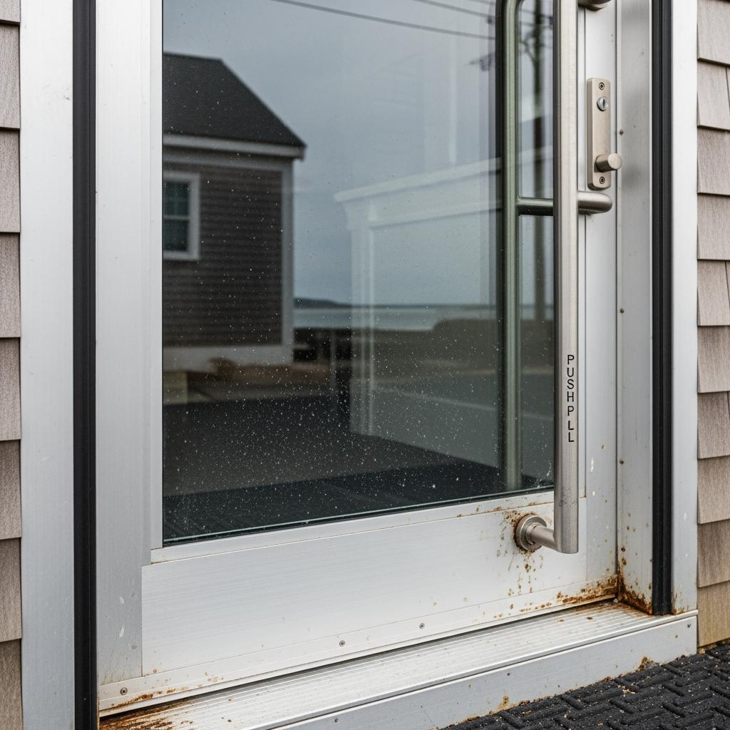 The coastal climate exposes doors to wind-driven rain, salt, and temperature swings, which can accelerate wear on seals, hardware, and finishes. Choosing corrosion-resistant hardware, laminated or tempered safety glass, and properly rated storefront framing helps your doors stand up better over time.