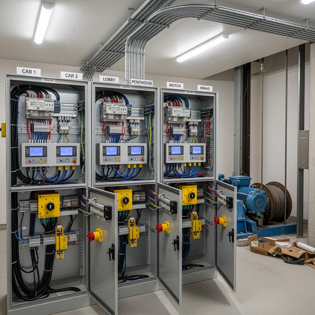 Installation is usually phased car‑by‑car or in small groups to maintain service. Each car is taken out of service, old control equipment and fixtures are removed, and new controllers, cab wiring, door operators, and hall fixtures are installed. After wiring and parameter setup, the car goes through internal testing, followed by official inspections and ride quality tuning. In a high‑rise group, the group controller and dispatching logic are implemented and tuned as more cars come back into service.