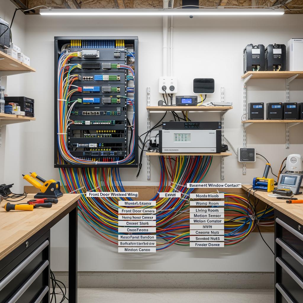 In a typical NJ new‑build or major renovation, your pre‑wiring plan should include cables to soffits and eaves, major entry doors, garage ceilings, and any planned gate or driveway posts. Inside, you may want hidden junctions above key hallways and common areas. All of these cables generally terminate at a central low‑voltage panel or equipment closet where your NVR, router, and network switches will live.