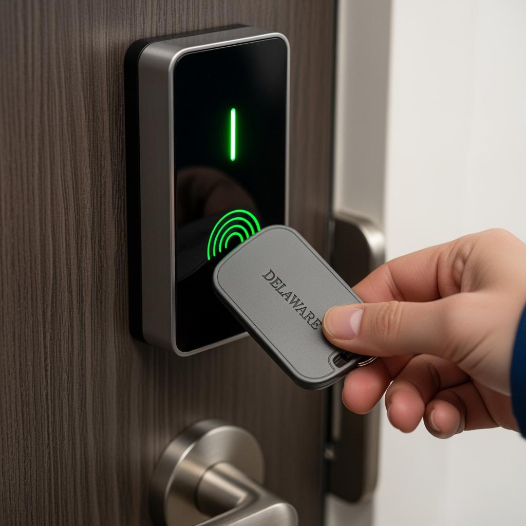 RFID door access for Delaware residents is a locking system that uses radio‑frequency identification cards, fobs, or phones instead of metal keys. A reader at the door checks your unique credential against a database and unlocks the door only if your access rights are valid.