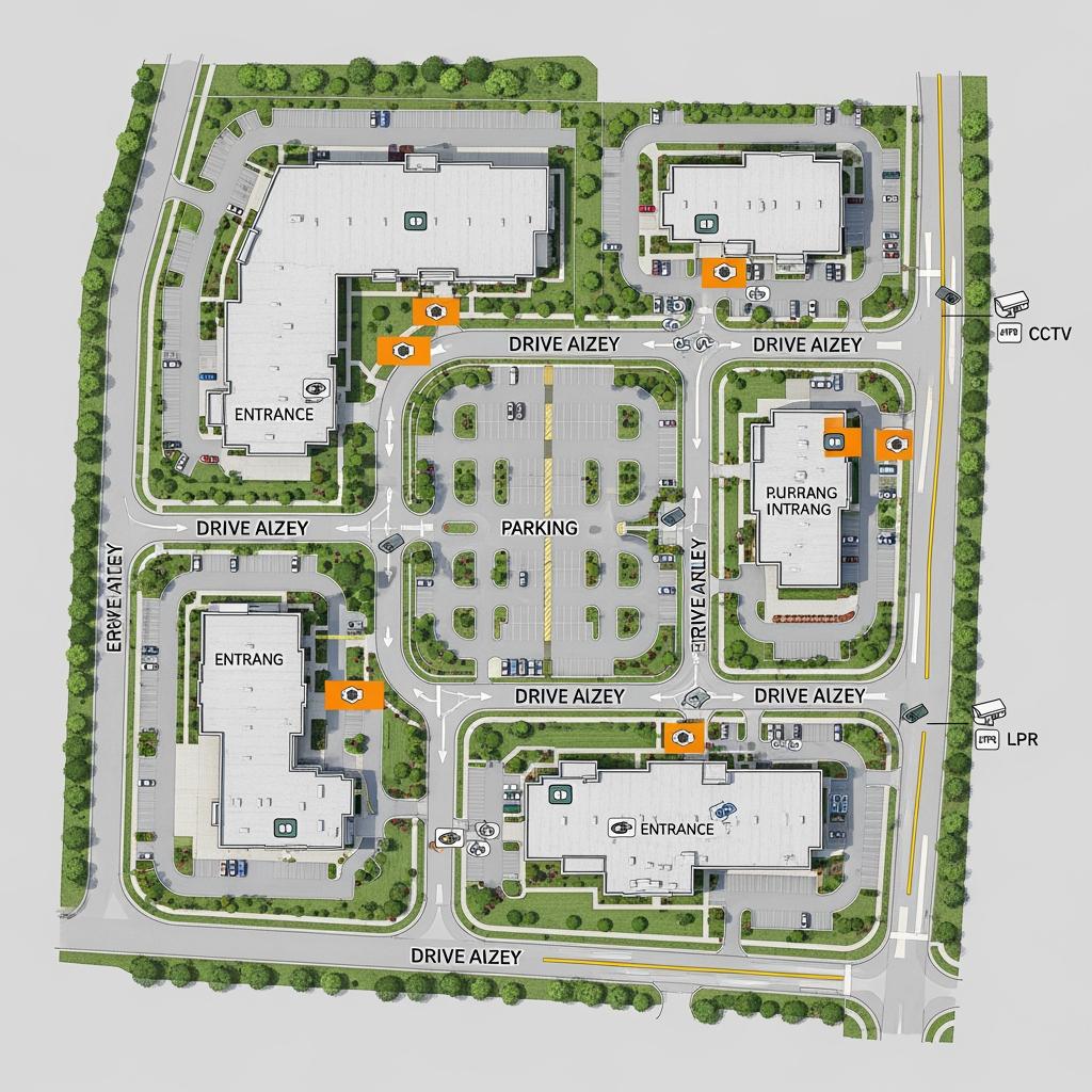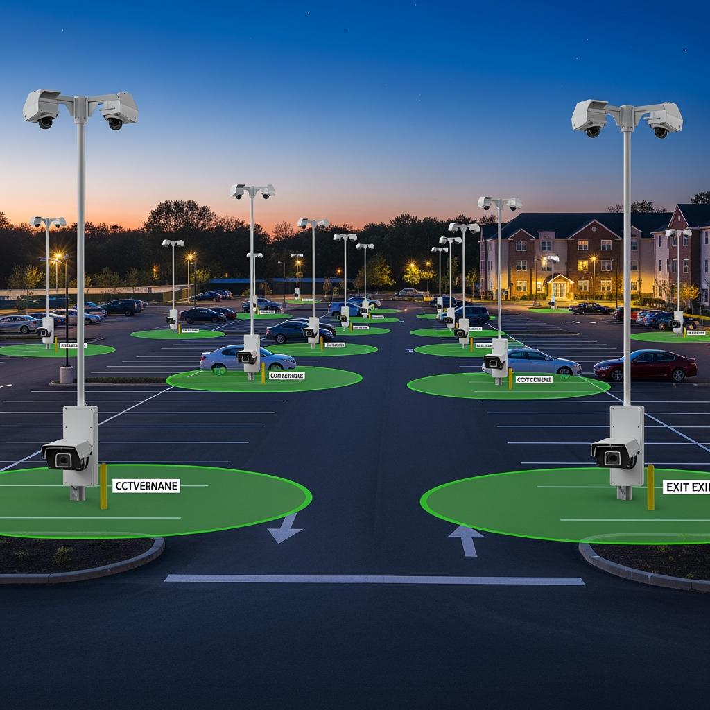 A basic coverage planning flow might look like this: map the lot → mark entry/exit lanes and pedestrian routes → place ALPR cameras at each vehicle choke point → add overview cameras covering drive aisles and parking rows → verify there are no blind spots where incidents have previously occurred. For garages, add attention to ramps, elevator lobbies, stairwells, and payment machines. Test sample camera views in daytime, nighttime, and poor weather conditions typical for New Jersey.